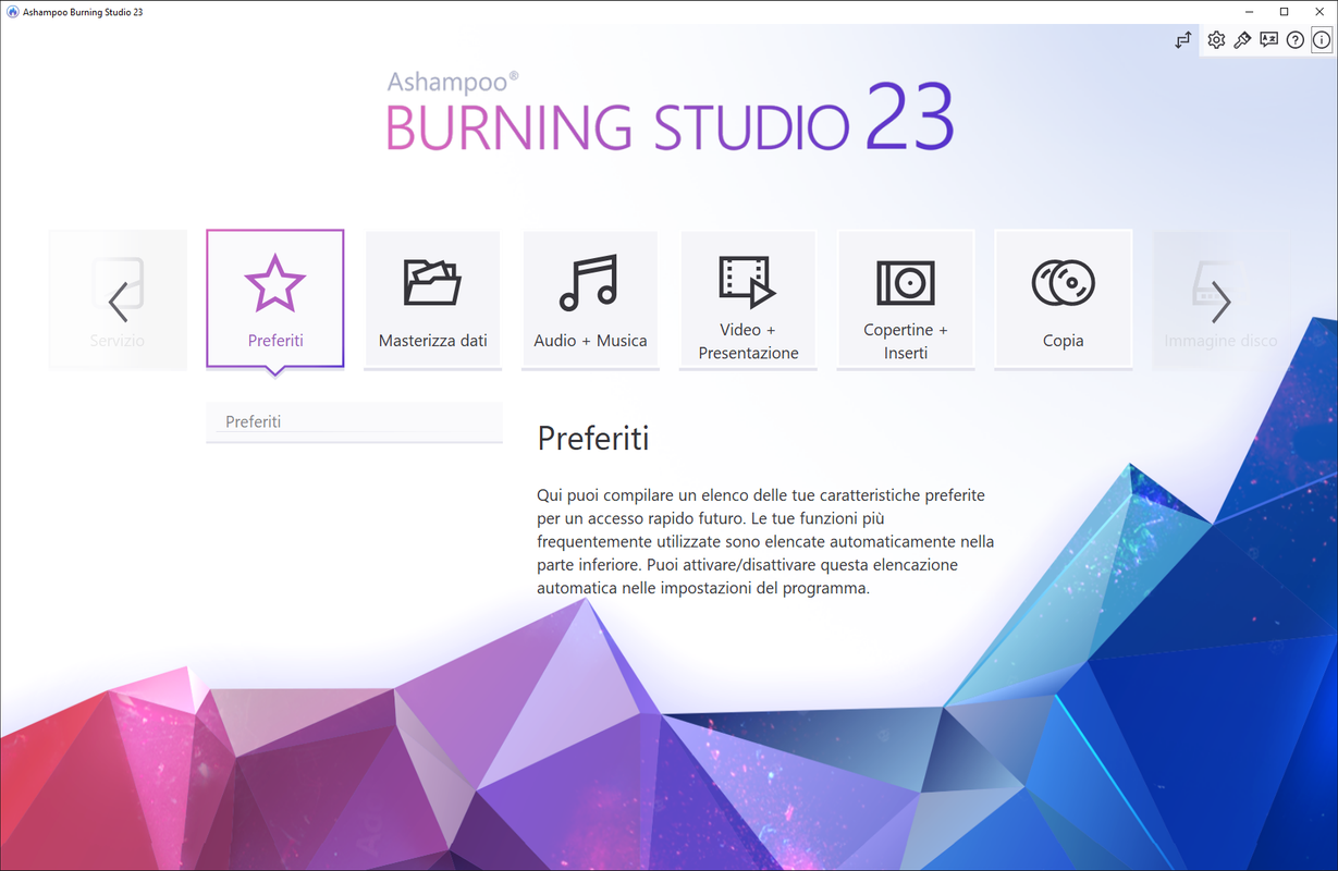 Ottieni il programma di masterizzazione definitivo per il tuo PC! Il nuovo Ashampoo Burning Studio è il modo più comodo per masterizzare i tuoi dati in modo sicuro, copiare CD, DVD e dischi Blu-ray senza sforzo e accedere a un'ampia gamma di funzionalità multimediali top di gamma. Crea i tuoi filmati e presentazioni, modifica i dischi esistenti o crea dischi video con menu animati. Estrai l'audio dai CD musicali, esegui il backup dei file all'istante e, già che ci sei, crea copertine perfette per i tuoi progetti! Scrivi dati importanti su qualsiasi tipo di disco con una potente compressione e protezione con password e saluta la perdita di dati. In oltre le nuove funzioni utili per audiolibri, riproduzioni audio e podcast garantiscono un intrattenimento di alta qualità!