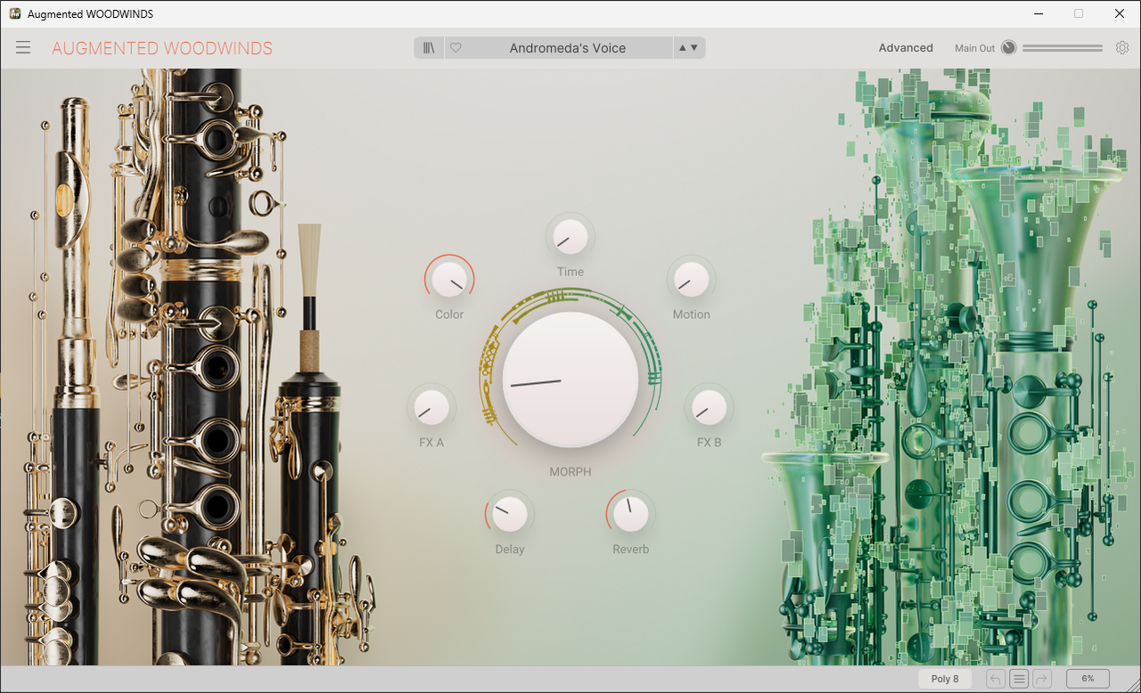 Augmented WOODWINDS unisce strumenti campionati dinamicamente con sintesi all'avanguardia in un'interfaccia intuitiva e mozzafiato, offrendo una gamma ricca, acuta e ridefinita di suoni di legni - trasformati in base al tuo umore, da oscuri e denaturati a luminosi ed eleganti.